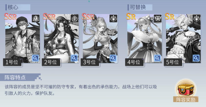阵容特点:该阵容的成员是坚不可摧的防守专家,有着出色的承伤能力。战场上他们可以吸引敌人的火力,保护队友。