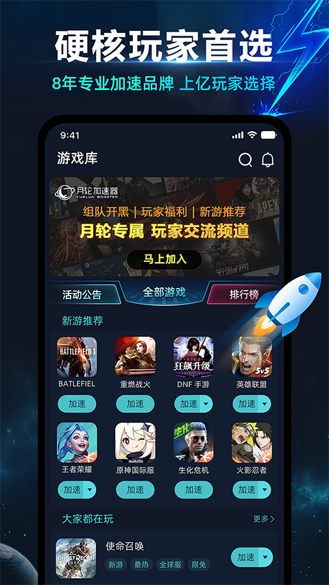 月轮加速器app是一款由厦门市月轮网络科技有限公司开发的一款游戏加速器软件,这款游戏加速器软件可有效解决开关游戏下载慢、掉线、卡顿等问题。同时支持决战平安京、第五人格、明日之后、荒野行动等游戏一键加速,以及能智能选路降低延迟防止卡顿,障各种游戏连接登录流畅顺利,加强手游稳定性不丢包。