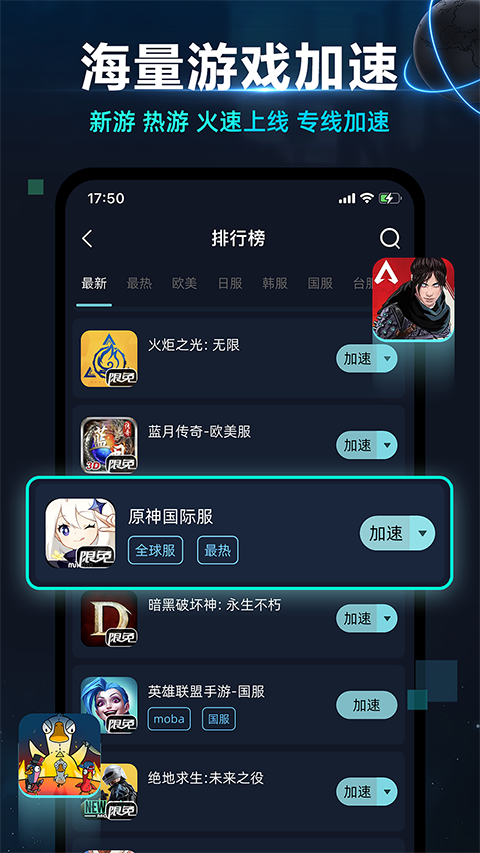 热门游戏全覆盖,支持3000+手游加速,专业加速吃鸡类、MOBA类游戏,决战平安京、第五人格、明日之后、荒野行动等游戏一键加速,高玩的选择,你游戏的助手,体验游戏超快感。