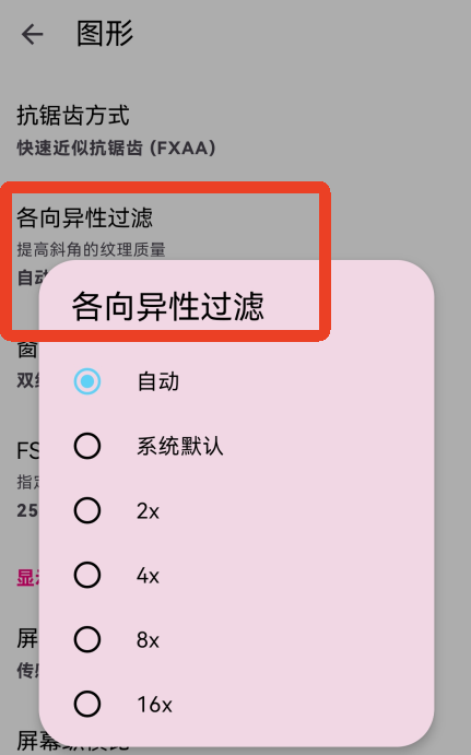 16、【各向异性过滤】选择【自动】,【窗口滤镜】选择【近邻取样】。