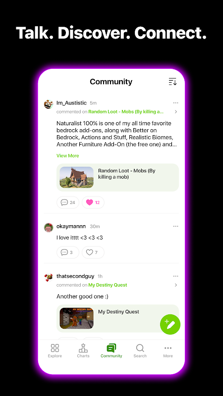 addons官方正版是我的世界游戏专用的一款mod模组获取修改应用,简而言之就是能够编辑修改玩家在我的世界游戏内的地图或道具模组。该应用囊括了大量地图模组,这些地图模组可以将我的世界原游戏地图修改至或者说导入成目标样式,可以免去玩家大量的制作时间。同时这些模组有着丰富的地图内容,冒险探索、怪物挑战、风景观赏等,种种内容都包括在内。玩家只需要在我的世界addons模组内寻找并下载好自己感兴趣的地图资源,然后成功导入我的世界游戏内即可开始畅玩,且导入方式也十分简单,小编也在下方为大家备好导入教程,以供各位玩家参考使用。