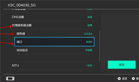 2、确保 Switch 成功连接至手机热点后,即可切换至App,并根据App提示,前往Switch修改互联网设置(下图中的网络代理、服务器地址、端口等信息仅作展示,请根据App实际提示进行连接);
