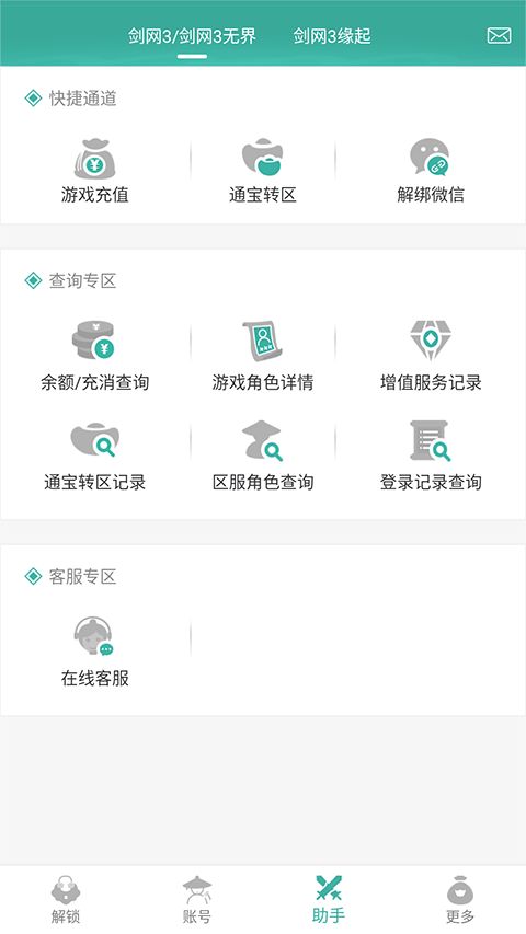 1、在首页点击【助手】,进入【游戏助手】页,在查询专区处选择【账号余额查询】,进入余额查询页面。