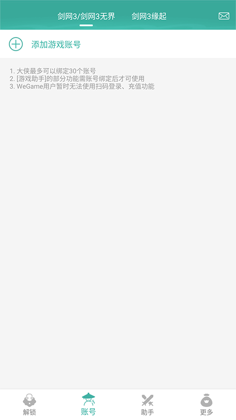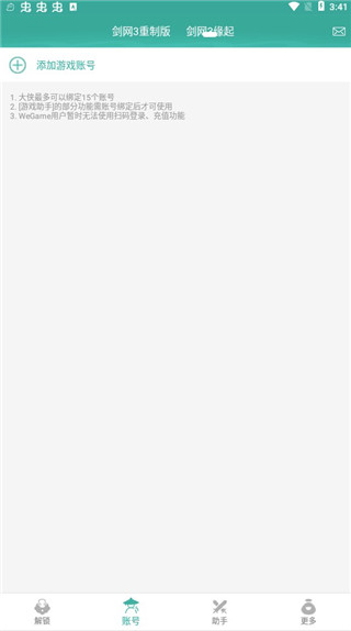 A: 支持绑定《剑网3》重制版和《剑网3缘起》的游戏账号,分别可添加15个账号。