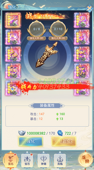 装备是本游戏最好获取的资源了,不断炼器就行。然后对装备进行强化、镶嵌宝石、洗练能大幅度提高装备属性。