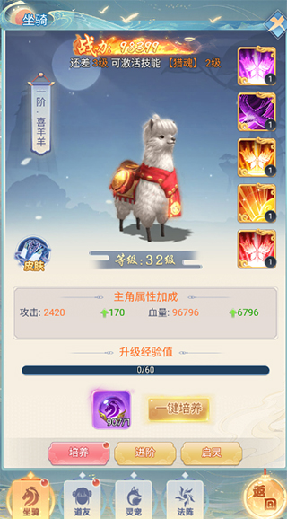 每个坐骑都有自己的技能,给坐骑升级解锁和升级技能能大幅度提高坐骑的战斗力