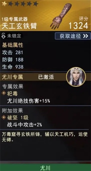 尤川专属武器绝品武器:天工玄铁臂。专属效果祀毒(绝技伤害+15%),附加效果破坚(战斗中攻击+2%)
