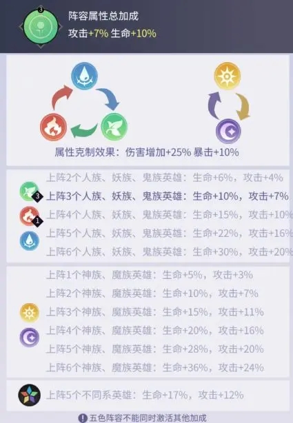 上阵5个不同系英雄:生命+17%,攻击+12%6