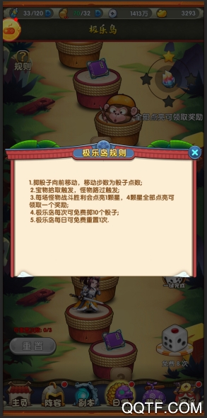 《乌龙院》的玩法繁多,有的紧张刺激、有的爆笑无节操,但其中以轻松休闲见长的,非“极乐岛”莫属了。蓬莱仙岛不但奖励丰富,而且好玩有趣,每天可以免费重置1次,付费进行2次。