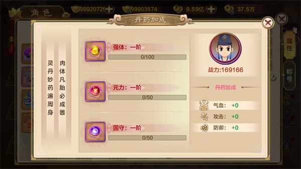 在角色丹药加成处,我们可以看到当前的丹药加成,和丹药上限。