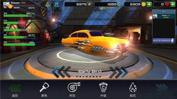 1、疯狂火箭飞车手游中有多种上世纪60年代的复古汽车可以让你选择驾驶,你可以自己定制你的汽车外貌零件等;