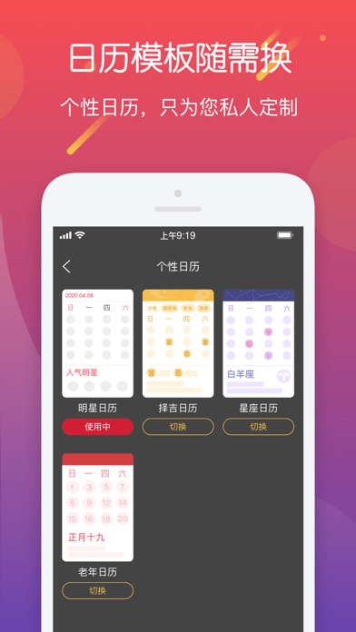 个性日历包括明星日历、择吉日历、星座日历、老年日历等,不同的用户不同的需求,都可以在个性日历里找到你最爱的那一款。更多日历模版还在不断更新中,只为不断给你创造新的惊喜!
