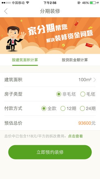 1、简单预约,您可以根据自己喜欢的装修设计风格简单的预约家分期装修公司。