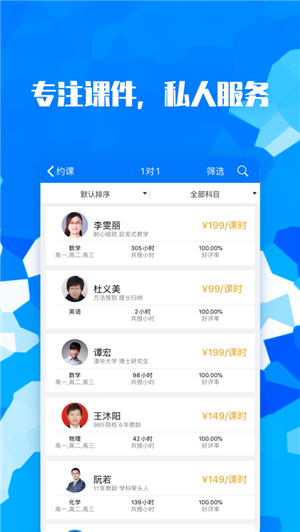丁牛辅导是一款服务于初高中学生的在线实时辅导软件。在这里,有985、211大学的状元和学霸,还有多年辅导经验的线下大老师。在这里,你能获得为你专属定制的课件,还有课后的在线答疑。想要提高你的分数?只需下载丁牛辅导