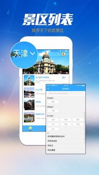 景区选择:按地区景区列表显示和按百度地图景区位置显示,有景区简介,可下载景区资源。