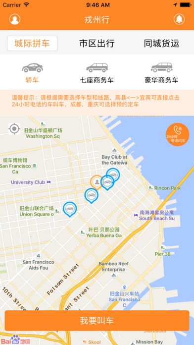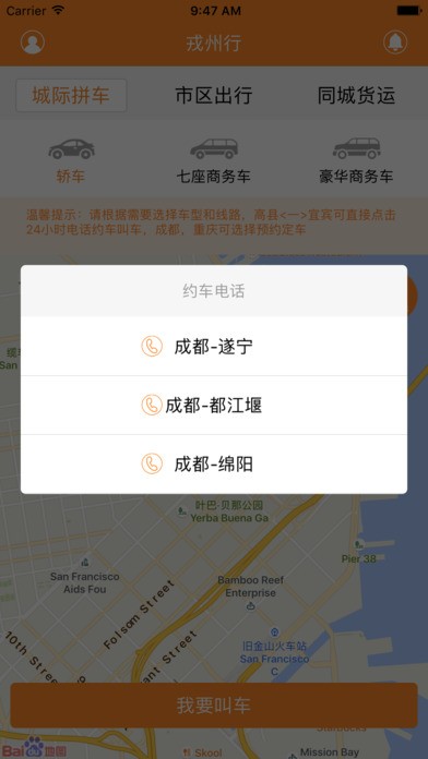 戎州行是一款综合了城际拼车,市内出行,同城货运的叫车平台,通过移动互联网整合城际、市内出行以及同城货运资源,为乘客以及司机搭建供需平台,解决乘客叫车难问题,并且提高司机收入。
