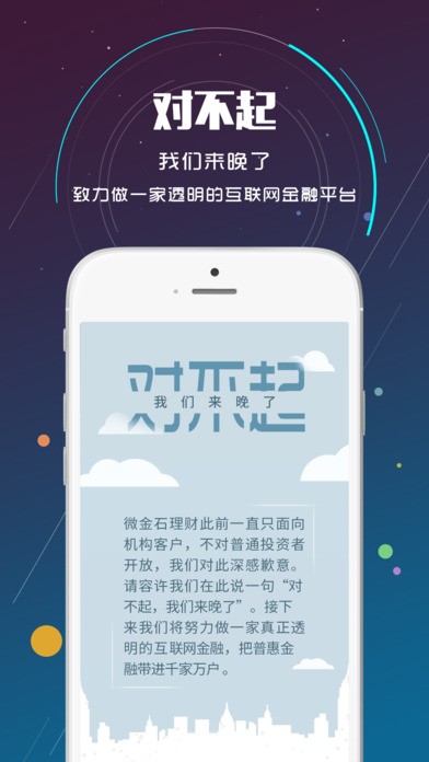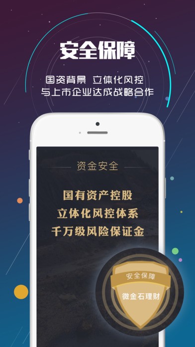 微金石理财,一家拥有国资背景的移动理财平台,在复杂的互联网金融大环境下,微金石理财致力于做一家透明的互联金融平台,有着专业的风控团队和安全的银行监制,让投资者更加放心的体验高收益低风险的理财过程。