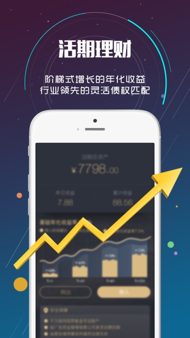 活期理财:严谨的活期匹配系统,让资金更加安全有保障,清楚每一笔资金流向,严格做好风控系统,年化利率达到市面上少有的阶梯性增长。