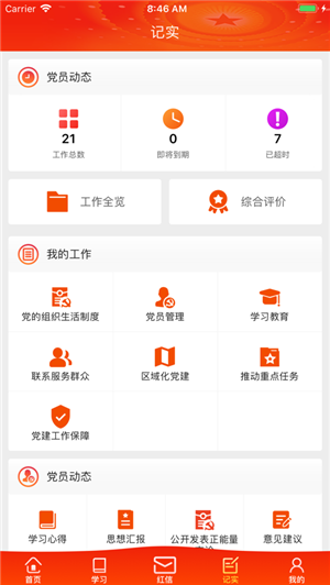 主菜单分设动态类、学习类、活动类、考核类、党内法规类、意见建议类6大内容,以及党建网站链接和个人信息2部分,让党建工作更清晰。