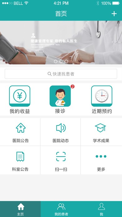 “快问诊”医生端包括:我的收益、接诊、近期预约、医院公告、医院动态、学术成果、科室公告、我的排行榜等栏目。