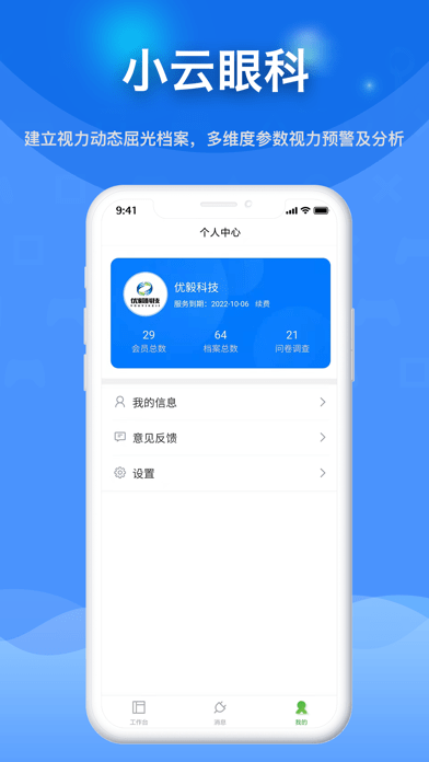 小云眼科是一款专业的眼健康管理软件,建立视力动态屈光档案,根据眼轴、眼压、屈光度等方面视力功能进行预警以及视力分析,协助视光中心制定最优治疗预防方案,通过软件,用户也可以更好的保护自己的视力。