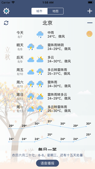 城市天气界面简洁,采用纵向展示7天天气,带有农历24节气信息,语音播报简单明了。